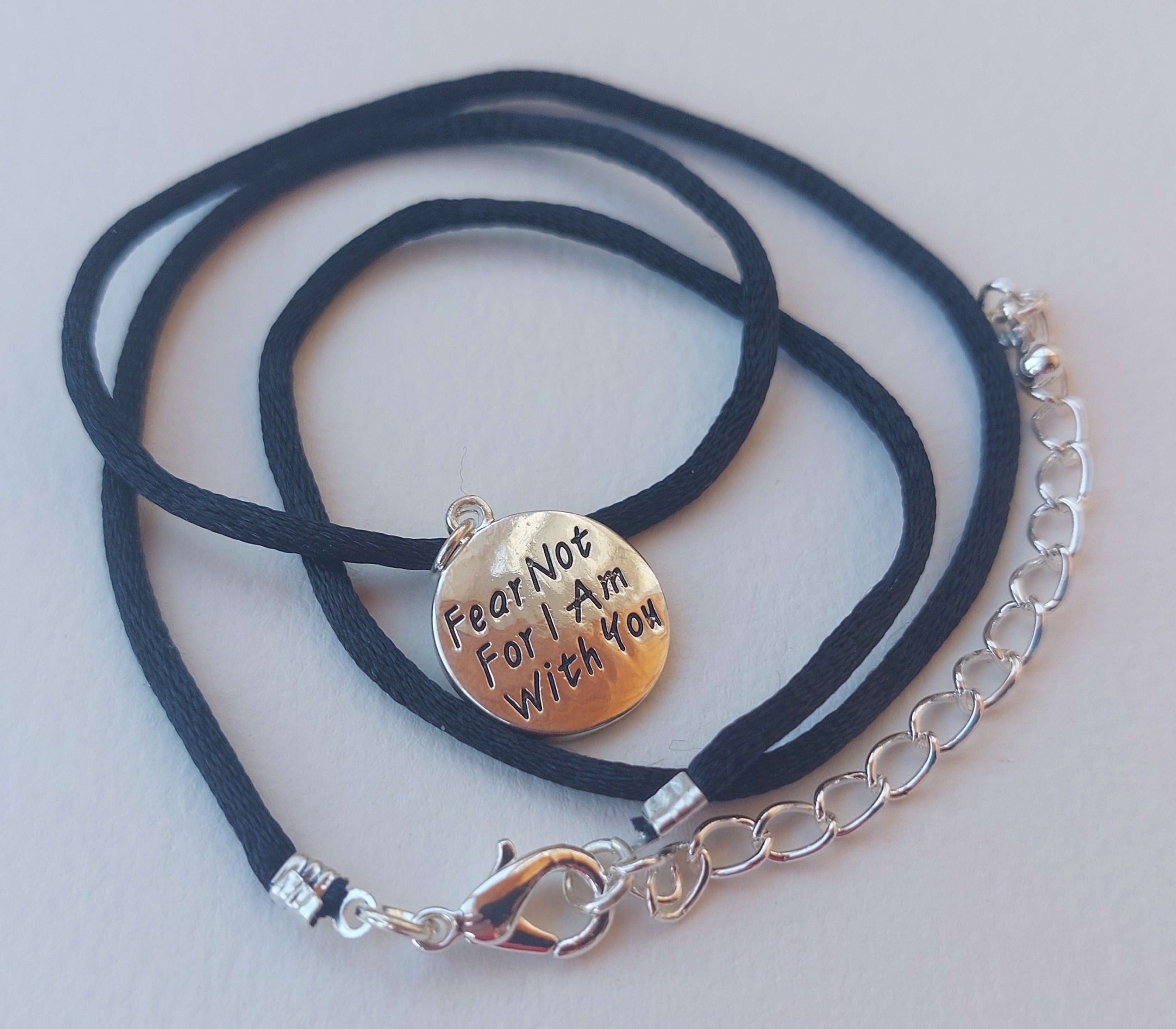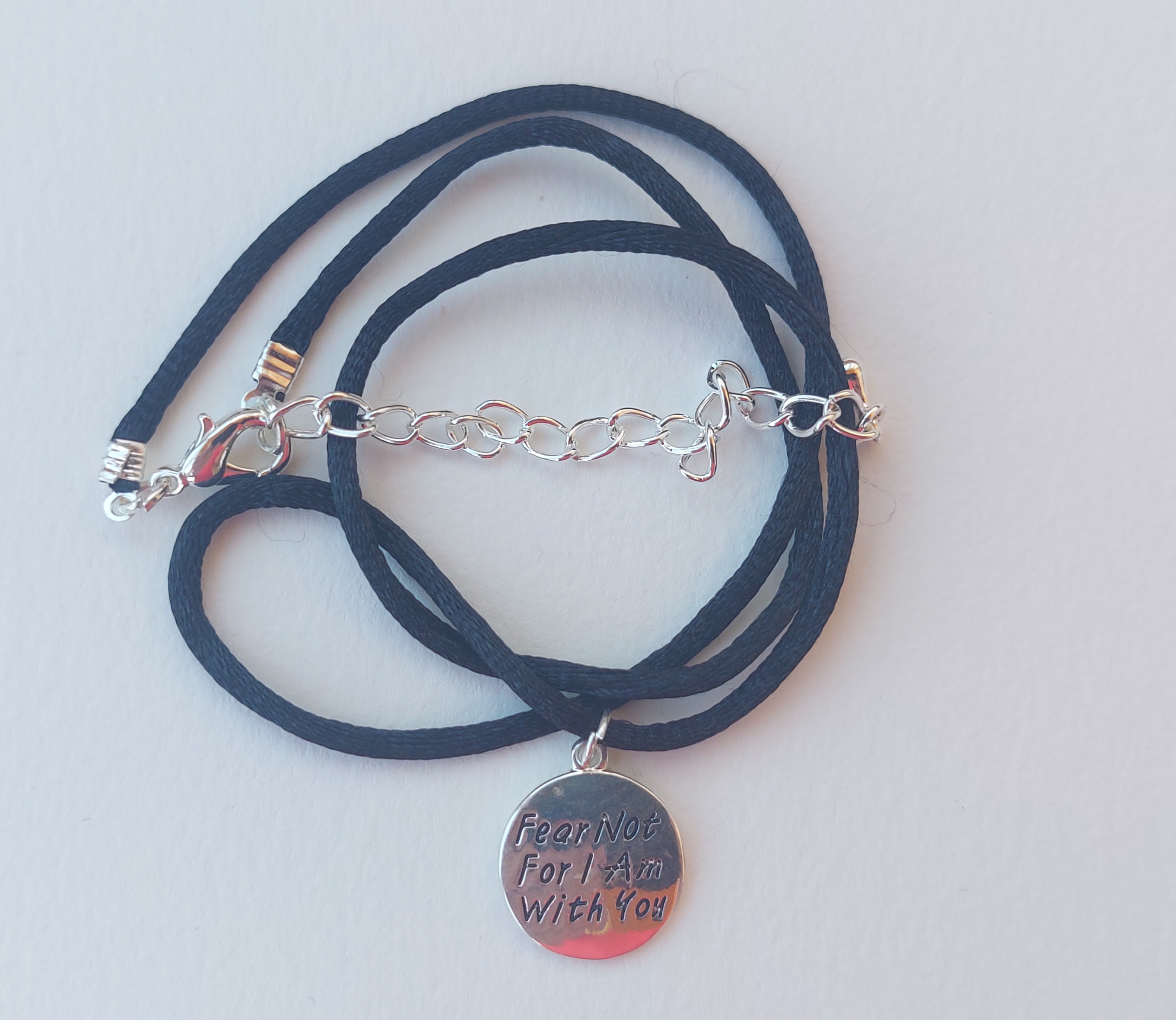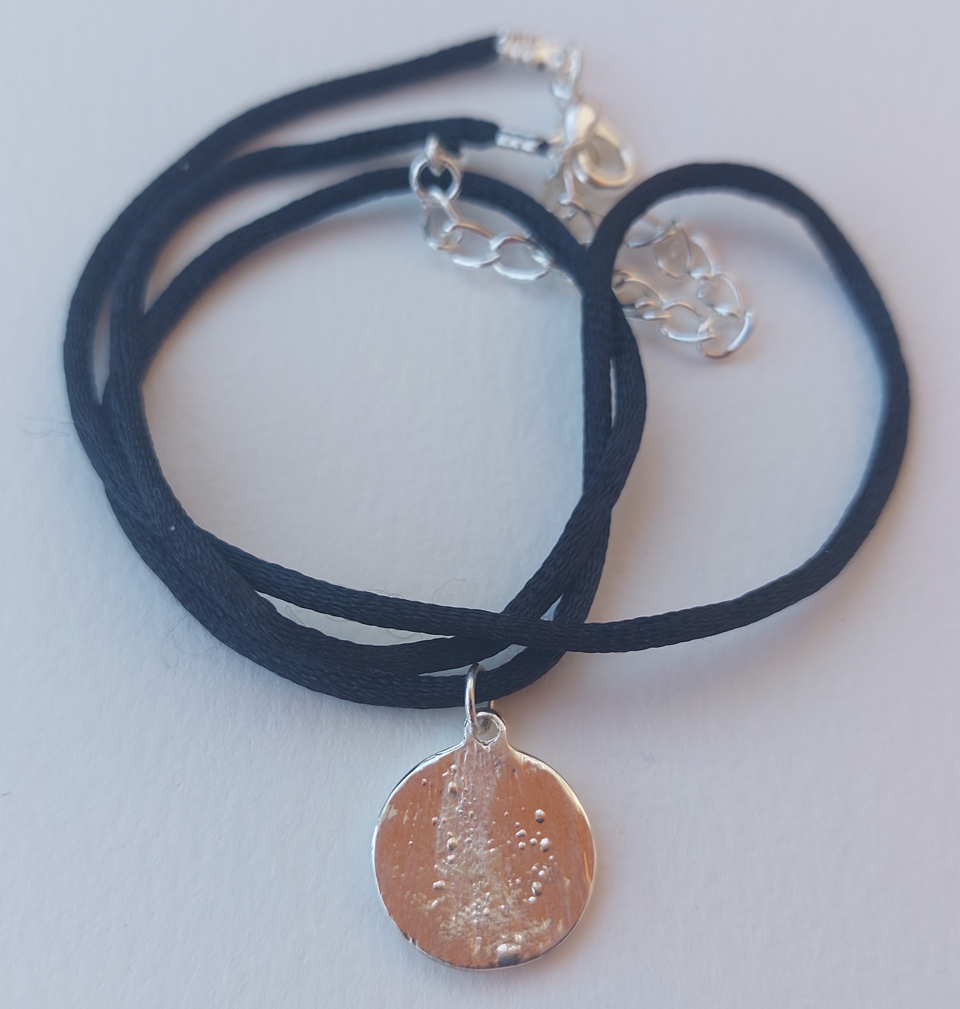 Описание:1. материал - металл покрытый хромом, "под серебро".2. диаметр кулона - 16 мм.3. шелковый шнур с металлической застежкой.