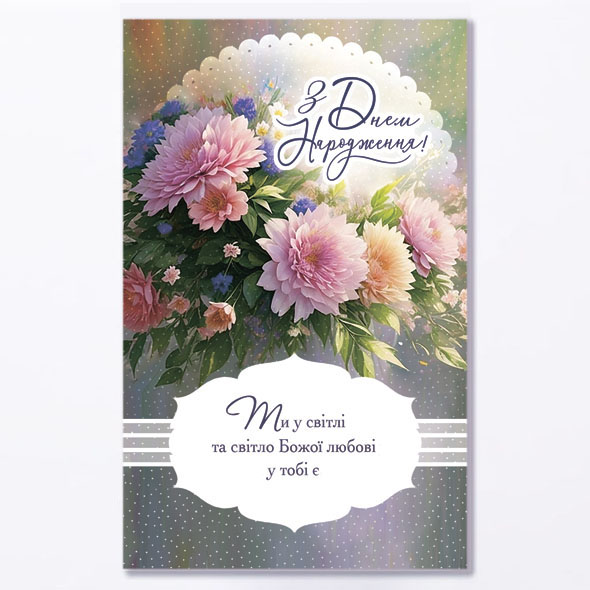 текст на зворотньому боці: "Нехай плід Духу зростає у тобі до повної зрілості, любов стає досконалою через Ісуса Христа, щоб як Він, так і ти сяяла у цьому світі".